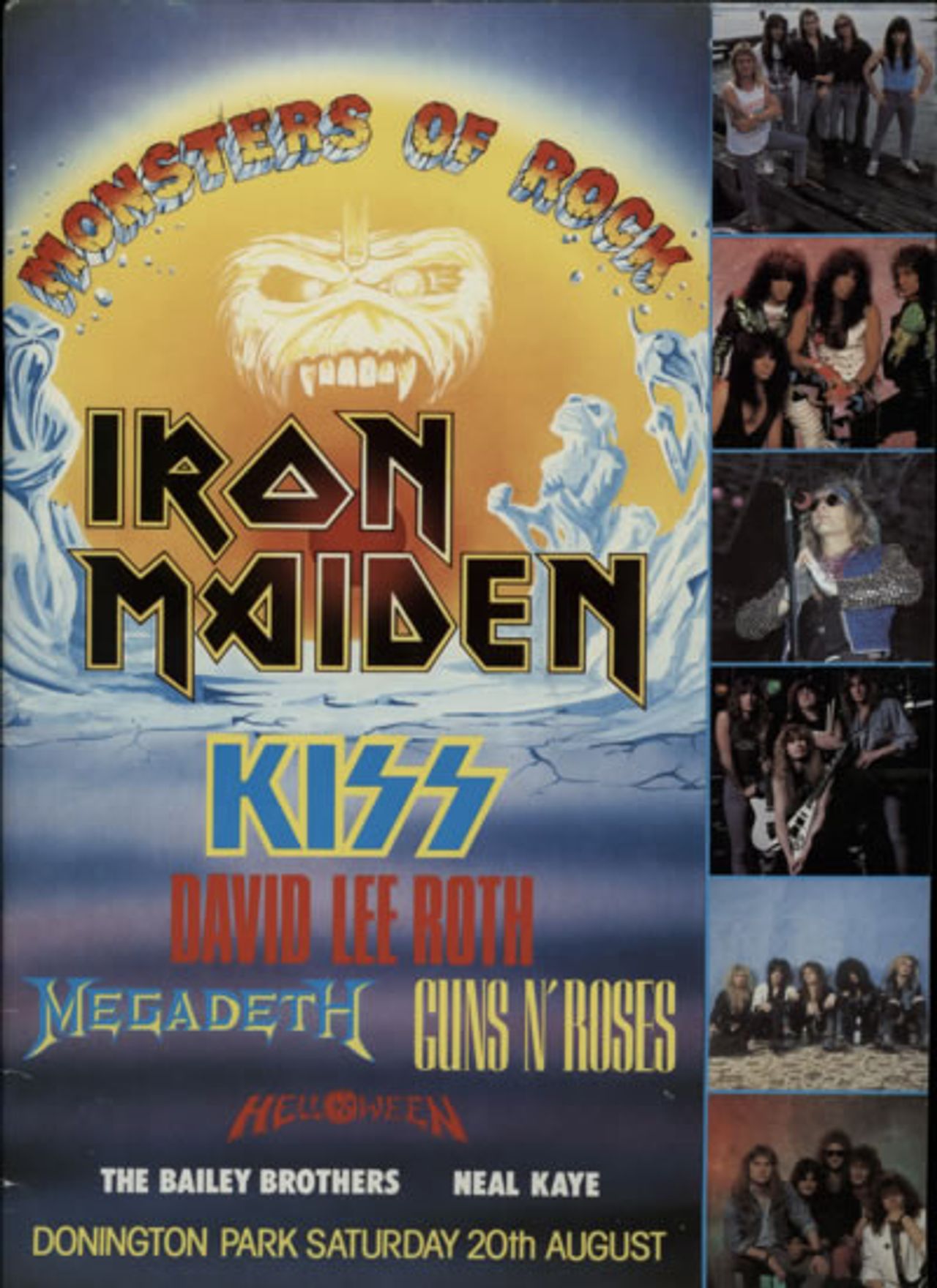 IRON MAIDEN Monsters Of Rock (Official 1988 UK 9½" x 13½" programme for the fesitval at Donington Park on the 20th August, featuring a map of Donington race circuit, an 8-page spread dedicated to Iron Maiden with text by Mick Wall along with individual articles about Kiss, David Lee Roth, Megadeth, Guns N' Roses and Helloween, with album / single and tour advertisements and merchandise insert still attached to the middle page spread. The front cover is ¾ in size and features the great 'Eddie' based artwork listing bands on the bill, whilst the back features a great advert for 'The Evil That Men Do' single. This example has some light general wear and remains in excellent condition, also comes with a picture ticket stub)