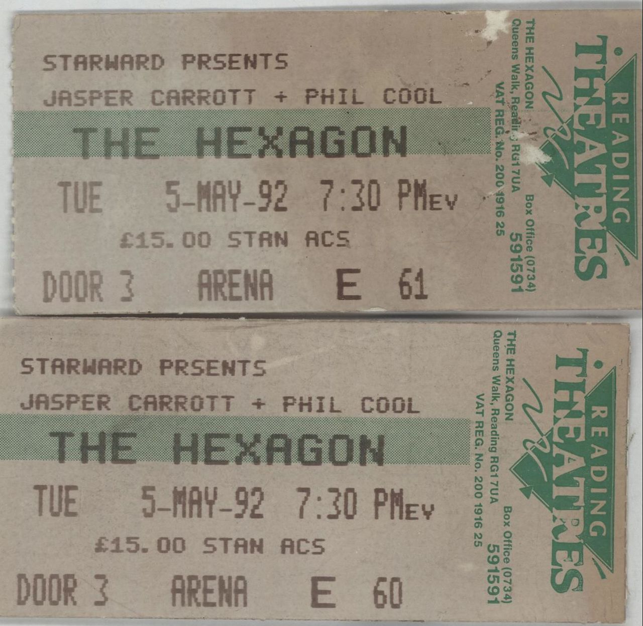 JASPER CARROTT The Hexagon, Reading 5-May-92 (1992 UK pair of concert tickets for the performance with Phil Cool as support)