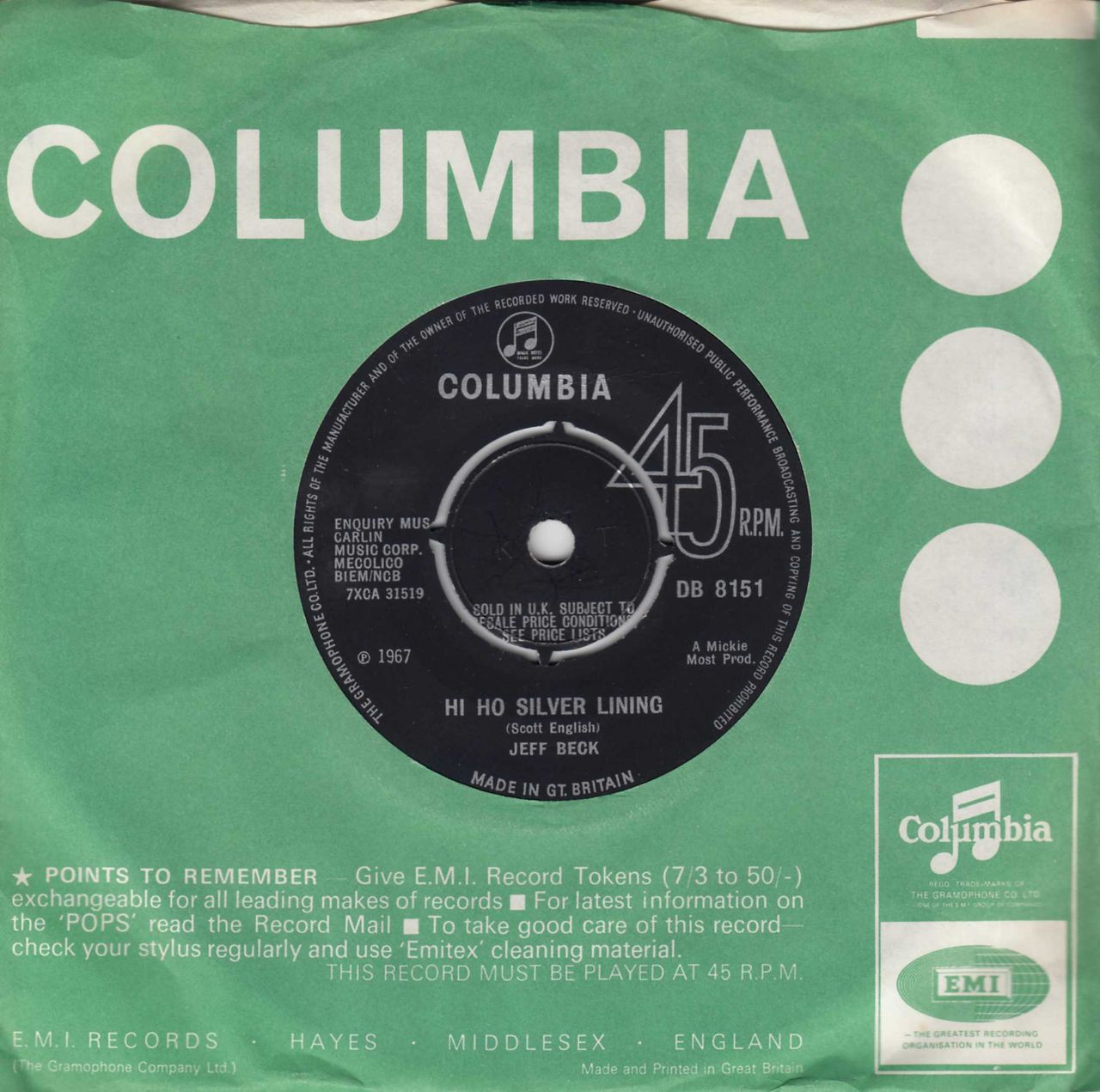 JEFF BECK Hi Ho Silver Lining (Classic 1967 UK 7" vinyl single with an intack four prong centre, also including Beck's Bolero written by Jimmy Page, Columbia die-cut company paper sleeve. The vinyl has only a few light cosmetic paper scuffs, otherwise remains excellent DB8151)