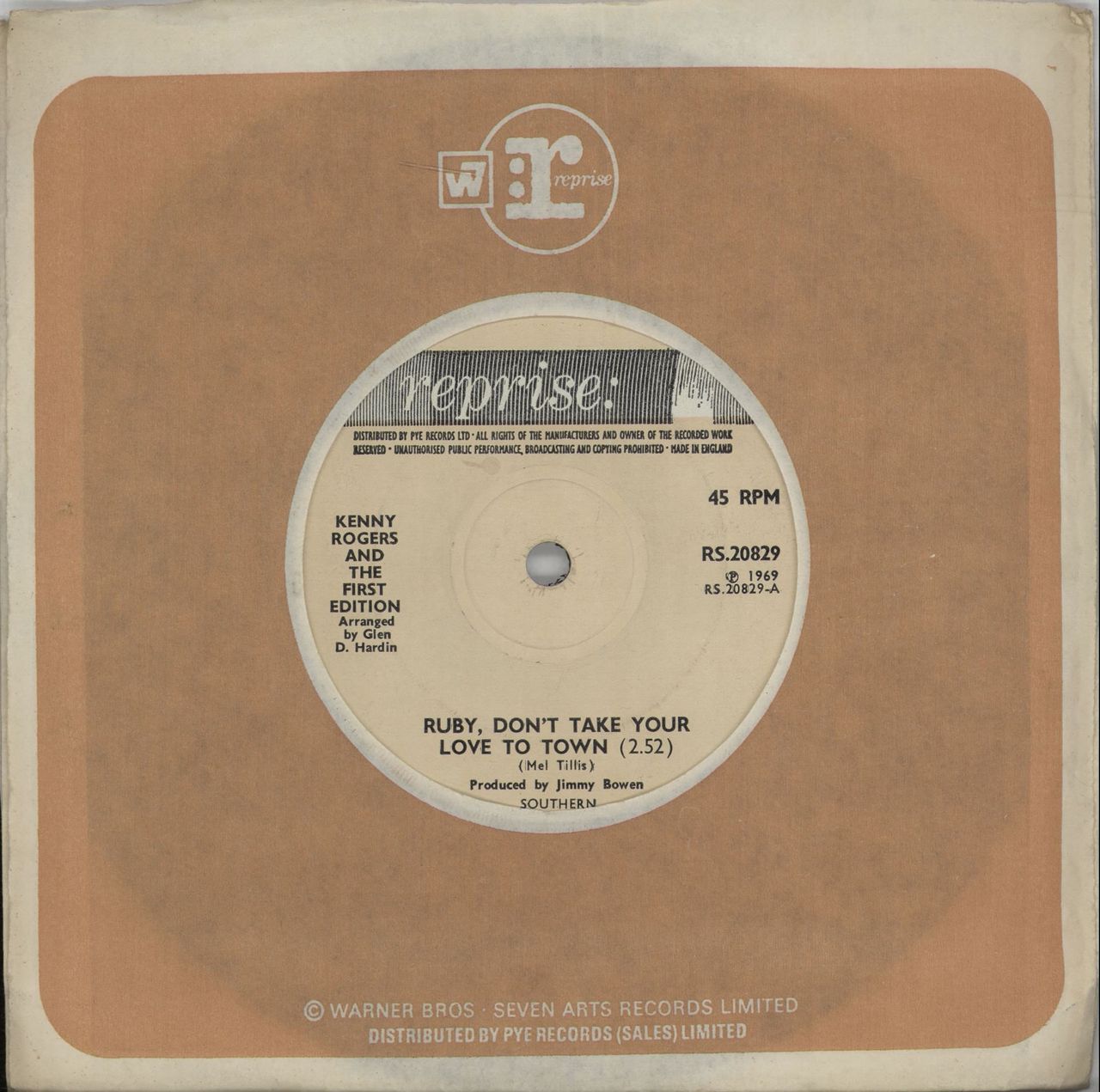 KENNY ROGERS & THE FIRST EDITION Ruby, Don't Take Your Love To Town (1969 UK solid centre 7" vinyl single, also including Girl Get Ahold Of Yourself, Reprise company die cut paper sleeve RS.20829)