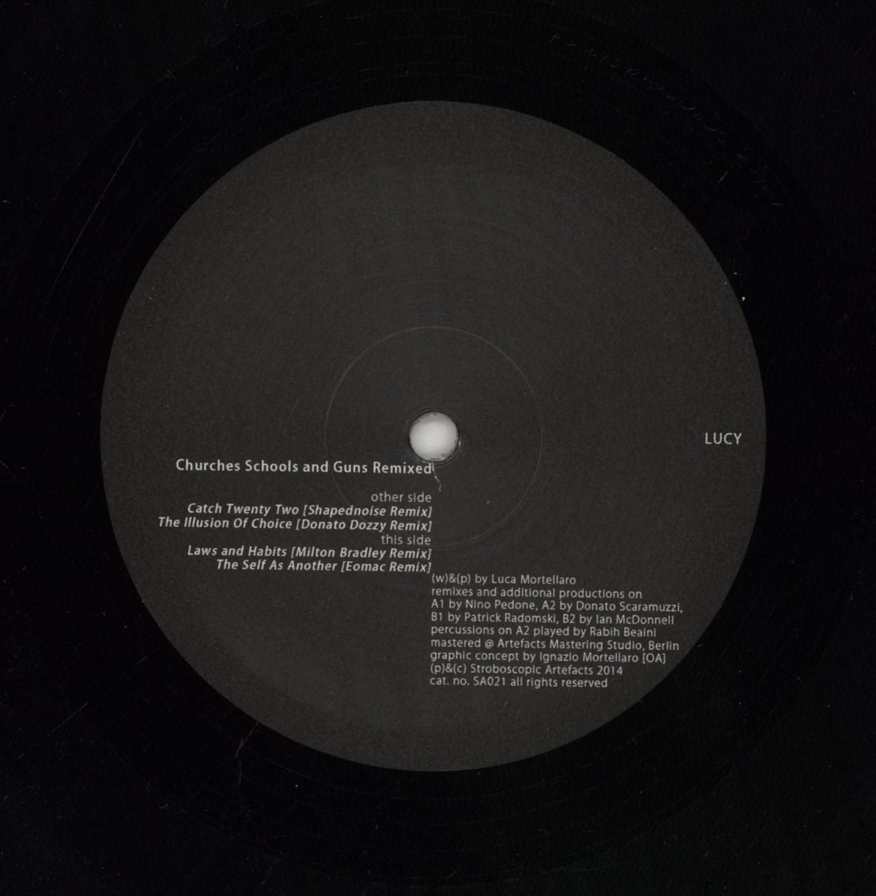 LUCY (TECHNO) Churches Schools And Guns Remixed (2014 German 4-track 12" vinyl EP. Featuring choice remixed tracks from the Italian techno DJ's album. Plain die-cut sleeve. The vinyl is in Near Mint condition SA021 )
