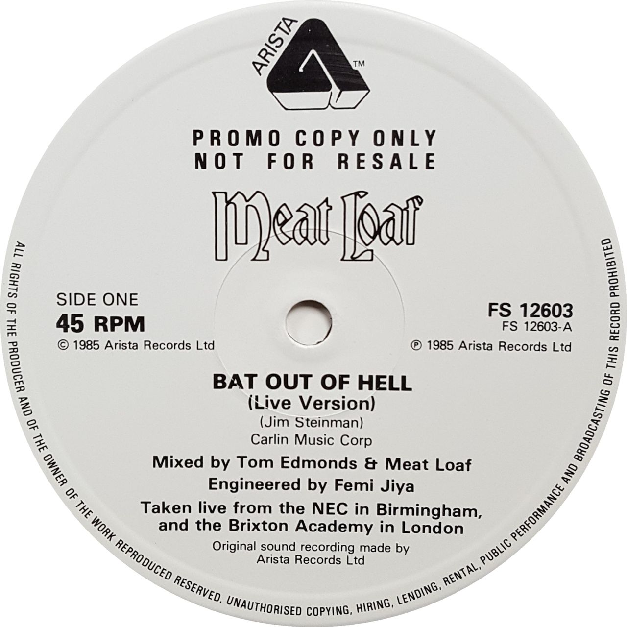 MEAT LOAF Bat Out Of Hell (1985 UK promotional vinyl 12" featuring a Live Version recored at the NEC in Birmingham & Brixton Academy in Long, also including Modern Girl US Remix, within a plain card sleeve. The vinyl shows very little evidenceof play FS12603)