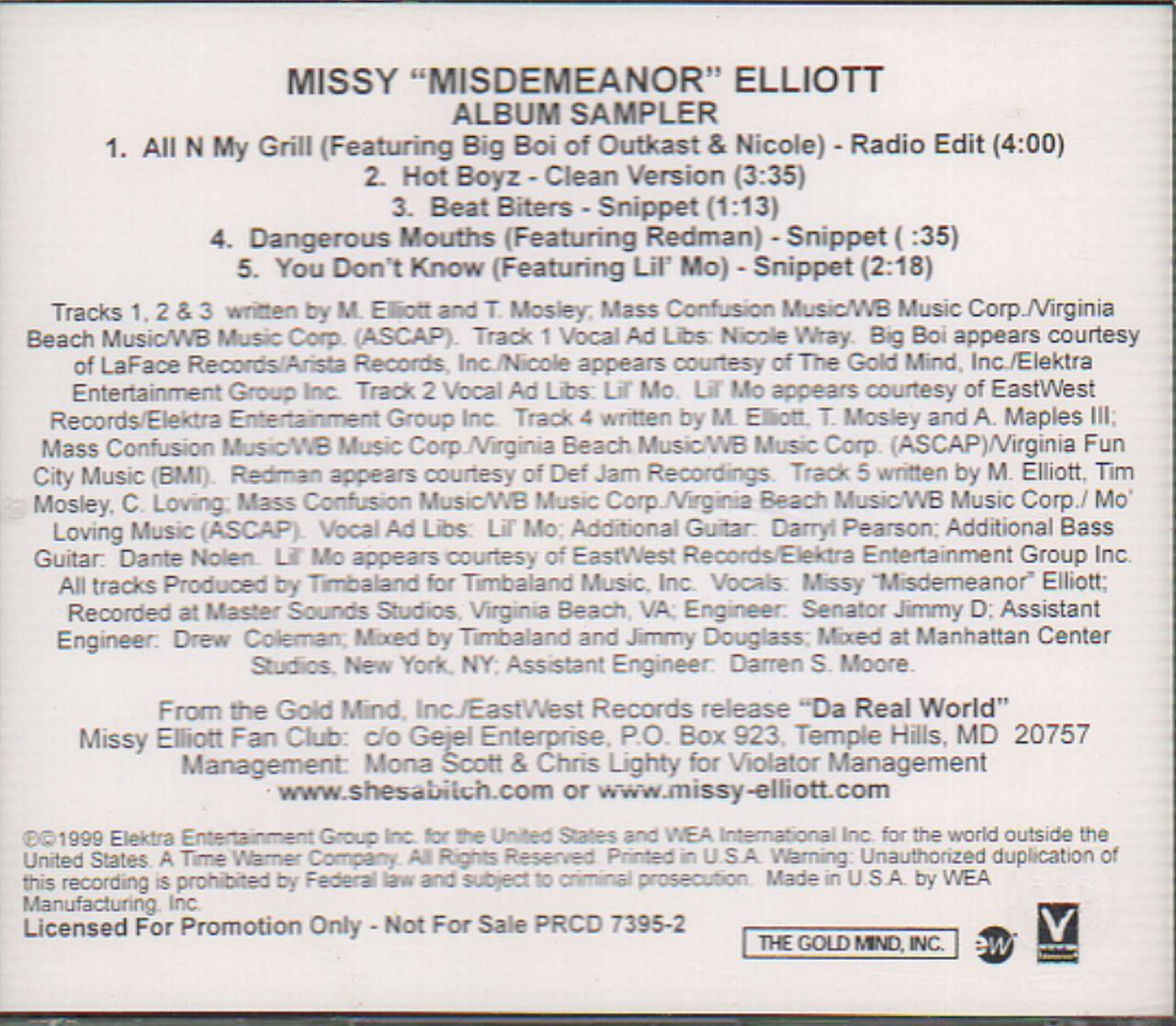 MISSY MISDEMEANOR ELLIOTT Album Sampler (1999 US 5-track promotional CD, includes Hot Boyz [Clean Version] and All N My Grill [Radio Edit], plus snippets of Beat Biters, Dangerous Mouths and You Don't Know, custom tracklisting back insert PRCD7395-2)