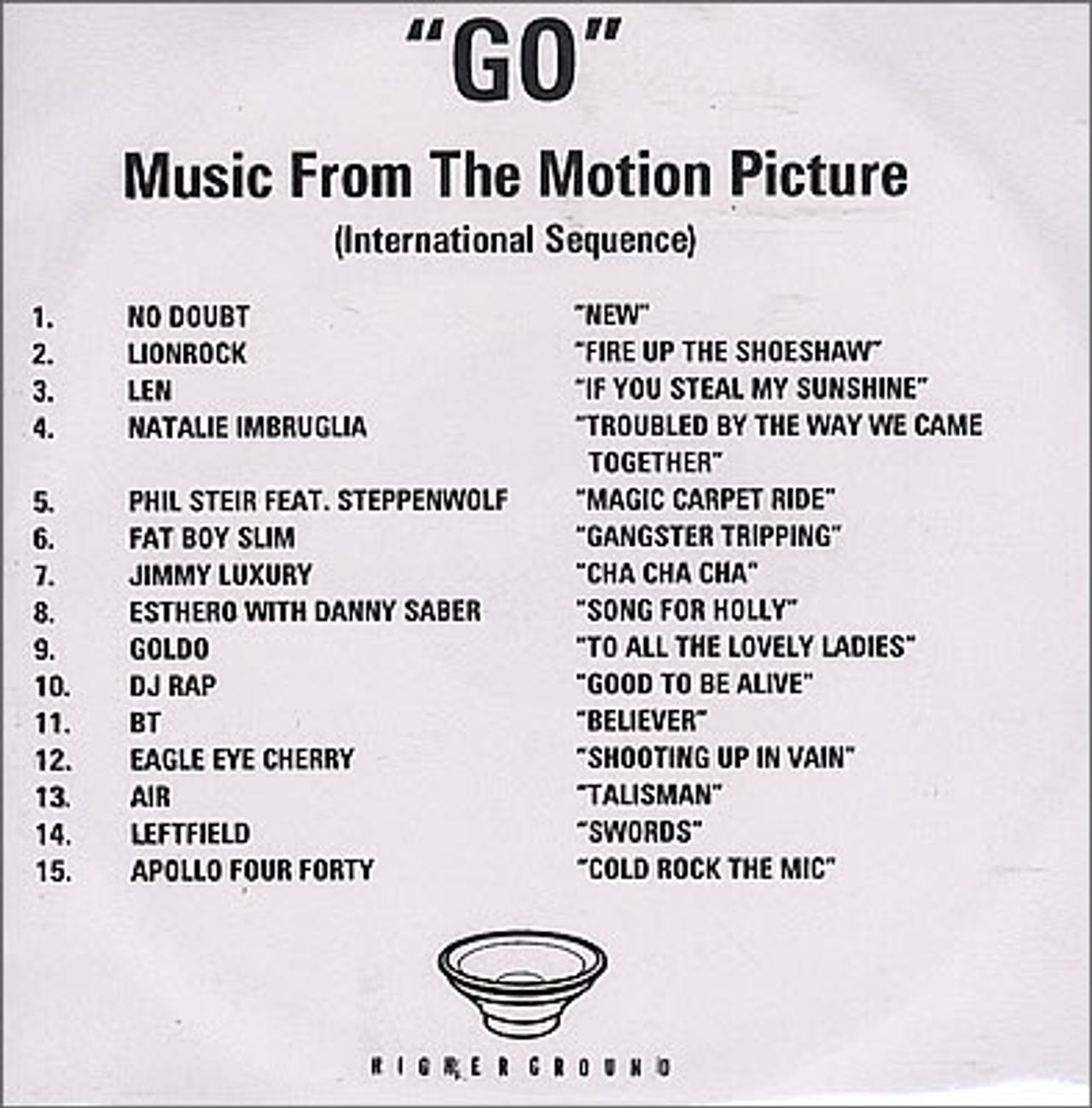 NO DOUBT Go (Official 1999 UK Higher Ground label 15-track CD-R acetate for the soundtrack to the feature film 'Go' featuring No Doubt's 'New' plus tracks by Natalie Imbruglia, Fatboy Slim, Air, Leftfield, Apollo Four Forty and more! Custom printed disc and title/tracklisting insert)