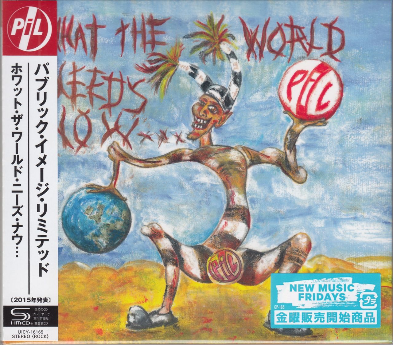 P.I.L. What The World Needs Now... (2023 Japanese exclusive limited edition 11-track digitally remastered enhanced SHM-CD [Super High Material CD - playable on all CD players], originally released in 2015, including the bonus track forJapan, Turkey Tits, housed in a fold-out digipak with picture booklet, lyric booklet and obi-strip. This is in a brand-new 'shop bought condition' still in the stickered unopened re-sealable bag. But that is not all, this also includes a promoonly circular logo sticker whichwas only available to customers who pre ordered the release)