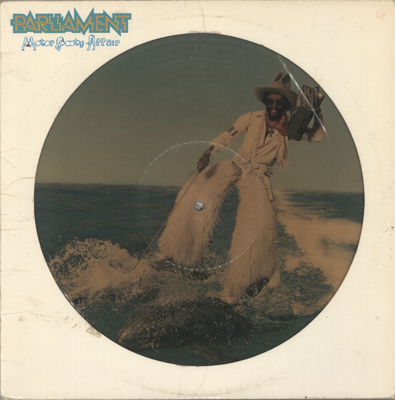 PARLIAMENT Motor Booty Affair (Scarce 1978 US limited edition 8-track Picture Disc LP, including the singles Rumpofsteelskin, Aqua Boogie and the totally bonkers DJ-Wiggles-the-Worm fantasy conjured up by George Clinton, who just happens to be surfing a dolphin with a ghetto blaster across the shoulder on the back of the disc! die-cut titled sleeve. The sleeve has minor shelfwear and the disc appears barely played NBPIX7125)