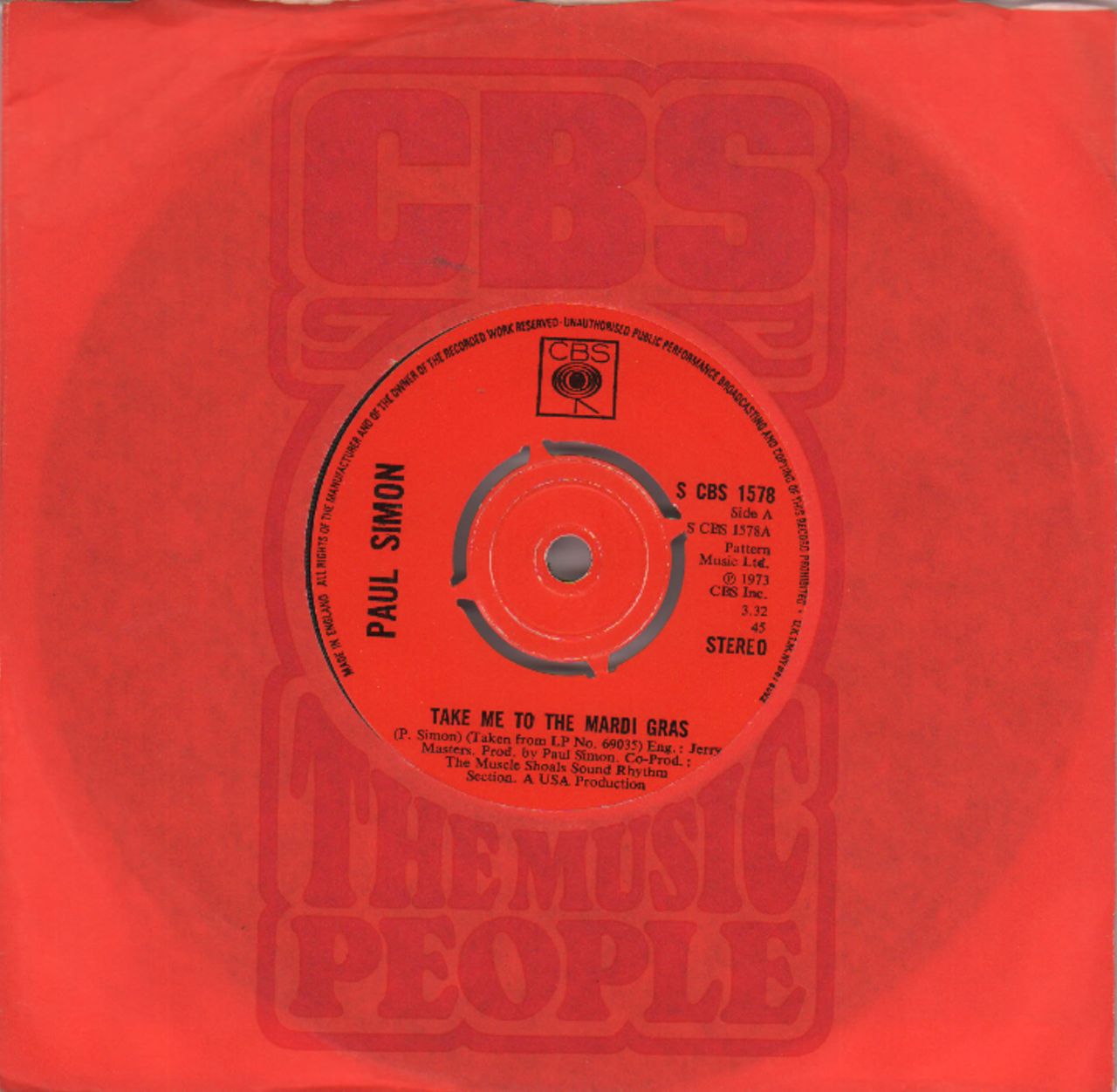 PAUL SIMON Take Me To The Mardi Gras (1973 UK CBS orange label 7" vinyl single with intact four-prong centre, also including Kodachrome, die-cut company sleeve CBS1578)