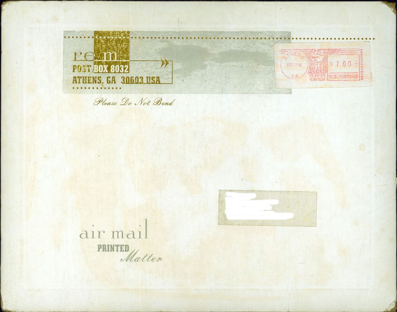 REM Live For Today (Rare 1997 US fan club only 2-track 7" vinyl single, also includes Happy When I'm Crying by Pearl Jam, in unique custom sleeve. Also includes greetings card and envelope, 8 New Adventures In Hi-Fi postcards, 1 band hologramlogo sticker, 2 bookmarks and folded embossed calender, all in the original custom mailing envelope! The sleeve and all contents remain in Near Mint condition L-49453)
