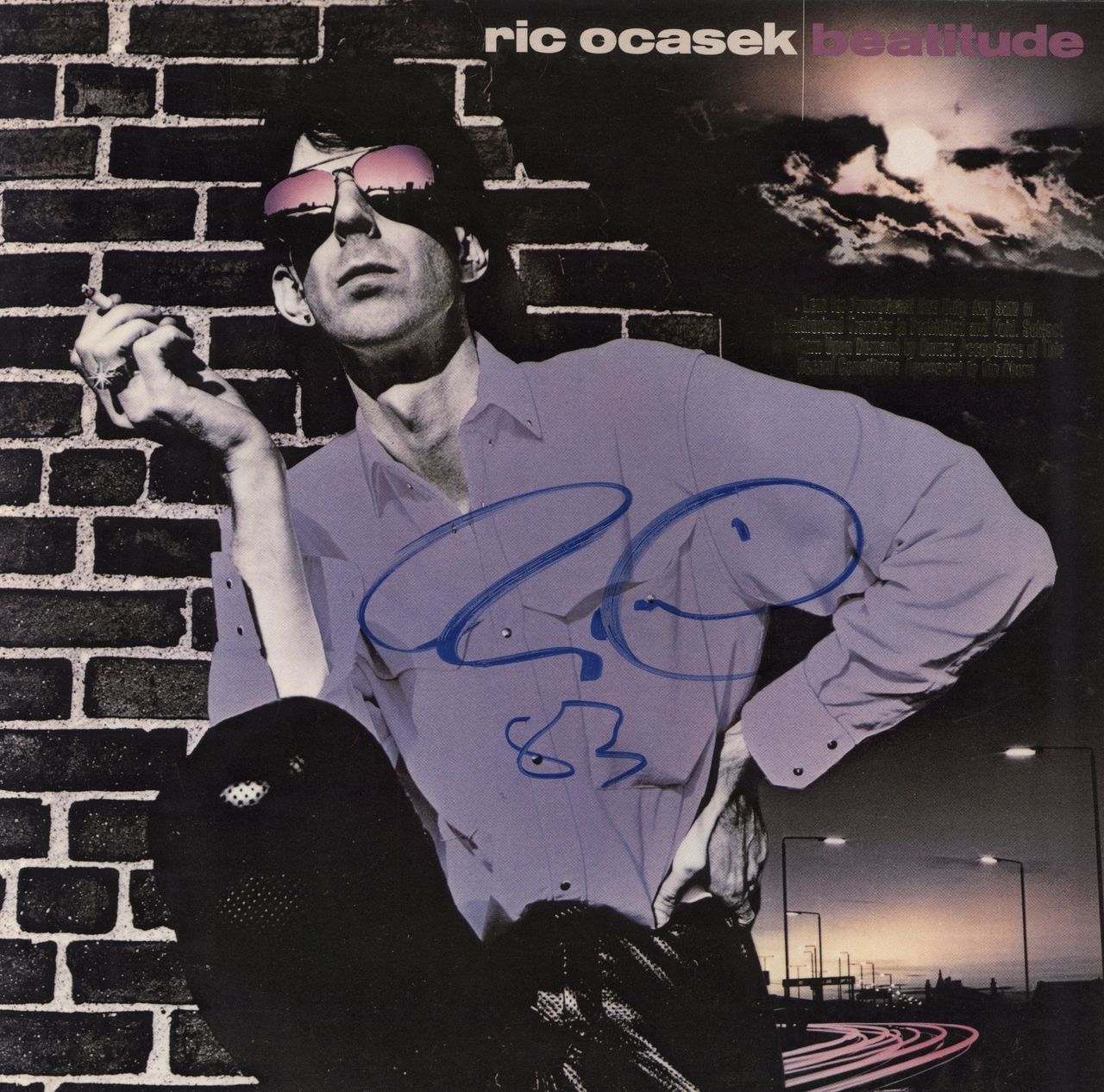RIC OCASEK Beatitude (1982 USA 10-track vinyl LP, gold promo stamped picture sleeve with lyric inner. This copy has been signed on the front by the late Ric boldly in blue marker and dated '83'. The sleeve shows light wear with seam splits tothe inner, whilst the vinyl is Excellent with few signs of play - a superb collectable GHS2022)