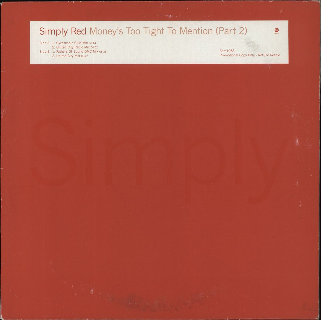 SIMPLY RED Money's Too Tight - Part 2 (1997 UK promo 4-track 12" including Gyroscopic Club, United City, Radio & DMC Mixes, red custom picture sleeve. The sleeve shows light general wear and the vinyl remains in excellent condition SAM1968)