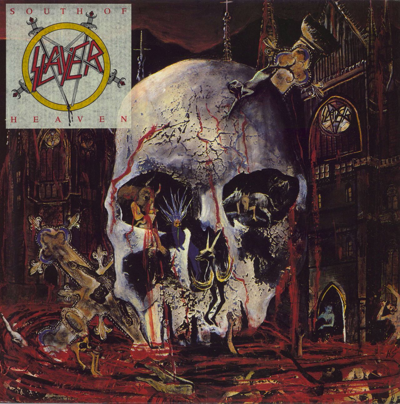 SLAYER South Of Heaven (1988 UK 10-track vinyl LP, the fourth studio album by the American thrash metal band, housed in a glossy picture sleeve with the scarce hype-stickered attached, and includes the lyric inner. The sleeve shows only light wear and the vinyl has only a few light signs of play. A superb collectors copy, with the hard to find and intact hype-sticker! LONLP63)