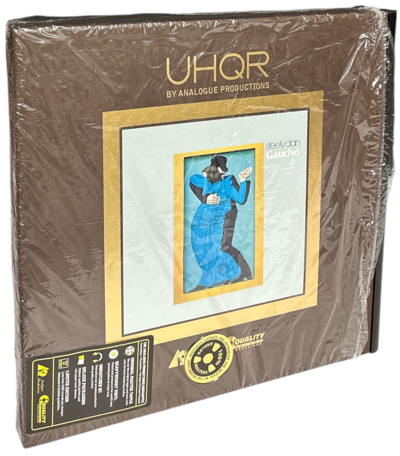 STEELY DAN Gaucho (2024 US UHQR limited edition 2×12" 45 RPM double LP on 200-gram Clarity Vinyl®, Analogue Productions – one of the finest reissues in the UHQR series. Mastered by Bernie Grundman from a 1980 analog tape copy originally EQ’d by Bob Ludwig, pressed at Quality Record Pressings. Housed in a full-colour tip-on old-style gatefold double-pocket jacket with film lamination by Stoughton Printing, inside a textured slipcase with leatherette dowelspine and gold-foil stamped numbering. Limited to 20,000 numbered copies. Although not sealed, both the box and its contents remain Near Mint, still in its original open shrink. Highly recommended UHQR0015-45)