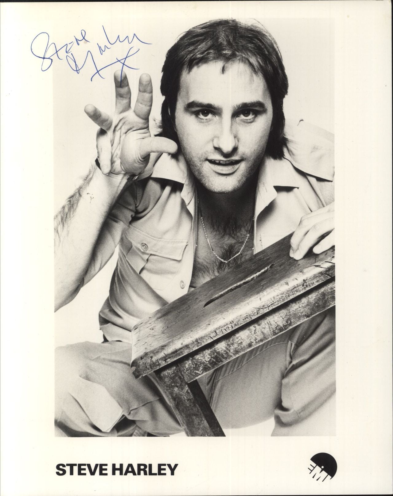 STEVE HARLEY Signed Photograph (Late 1970s UK EMI label black & white promo publicity photograph, featuring a great image of Steve, with artist name at the bottom and record company logo, measuring 10" x 8" in size. This has been boldly signedby Steve at the top in a blue point pen. This was acquired from an former EMI employee, who worked closely with the record label, their many artists and other labels)