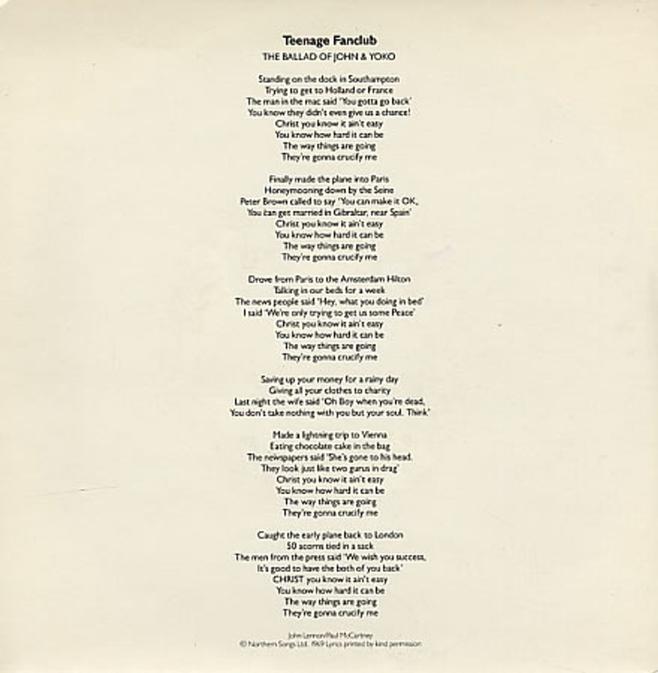 TEENAGE FANCLUB The Ballad Of John & Yoko (1990 UK Paperhouse label limited edition 1-sided etched 7" vinyl single recorded in New York's Fun City on 13th July 1990 with Wharton Tiers and mixed by Gumball's Don Fleming before being fittingly mastered at London's Abbey Road studio, lyric picture sleeve. The sleeve has only very light signs of wear and the vinyl has only very light signs of play PAPER005)