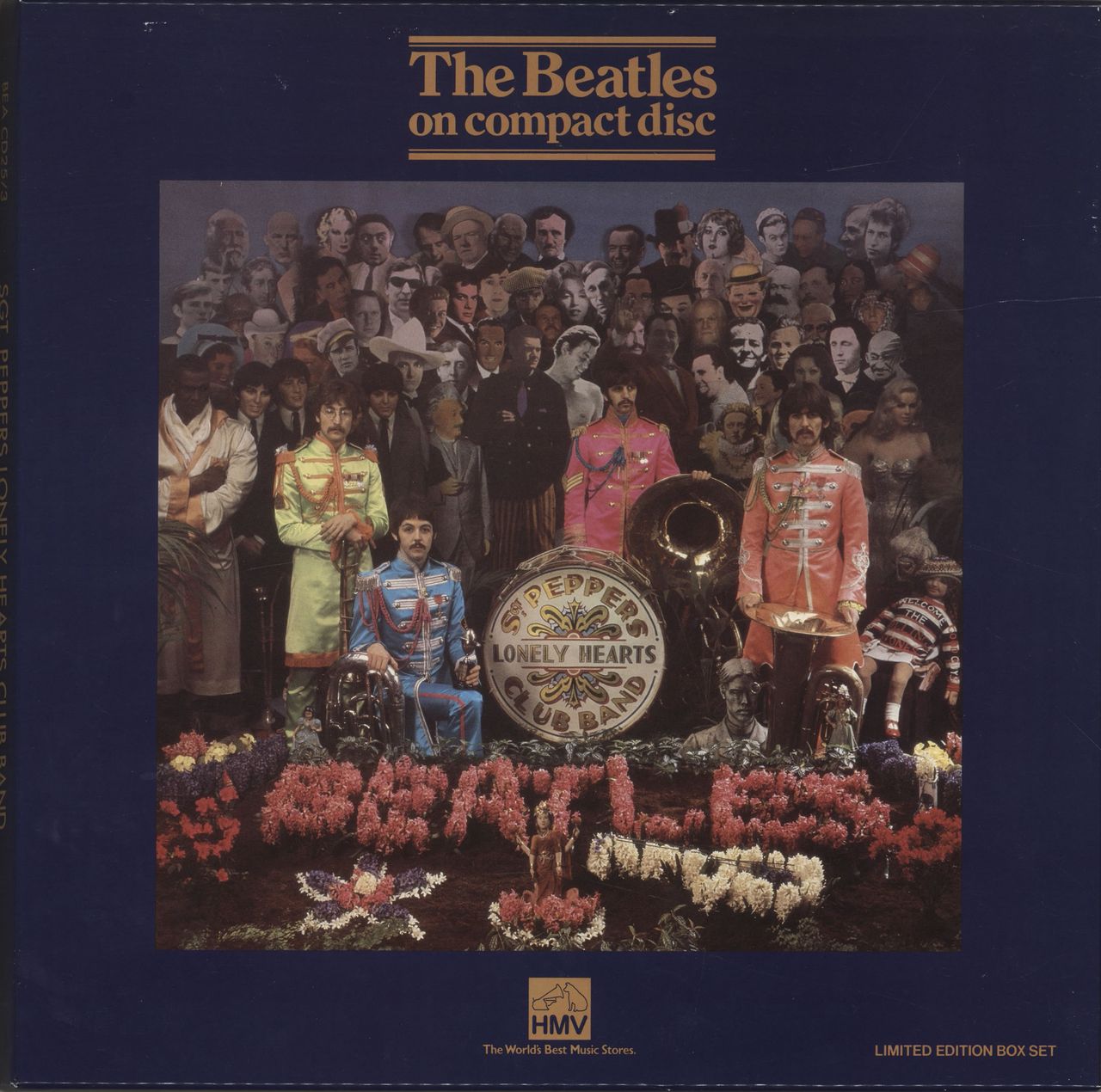 THE BEATLES Sgt Peppers Lonely Hearts Club Band (1987 UK limited edition HMV individually numbered box set, including a sealed copy of the 13-track CD in a picture slipcase, with a superb eight page 'behind the scenes' booklet and 12" cut-outssheet, 12" square picture box. The box has some corner scuffs and general shelfwear, the contents remain in near as new condition BEACD25/3)