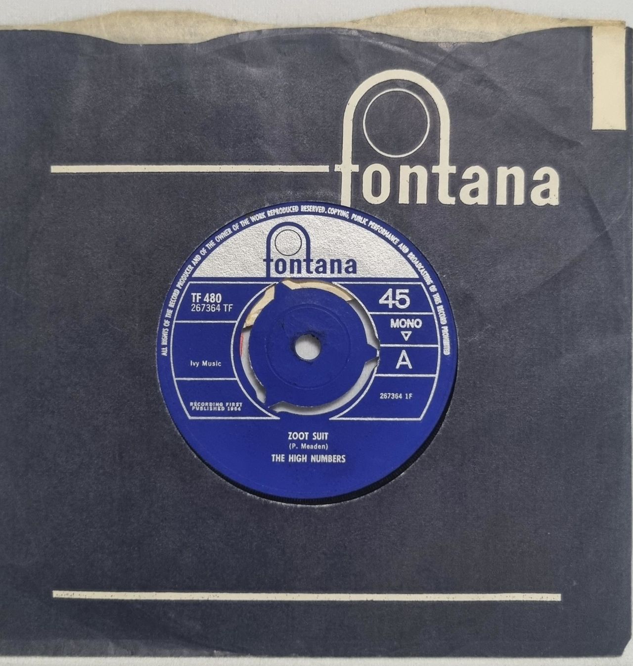 THE HIGH NUMBERS Zoot Suit (Super rare and highly sought after debut recording by a pre-Keith Moon The Who, original 1964 UK Fontana 7" vinyl single with textured 'Factory Sample' stickered 'Mono' label with anti-slip ring and intact 3-prong centre, die-cut company sleeve. Top '60s Mod action from this early incarnation of the band, Zoot Suit is their take on the US R&B tune 'Misery' [The Dynamics] backed with 'I'm The Face' a cheeky re-work of Slim Harpo's Mod fave 'Got LoveIf You Want It'. The lyrics to both [and band name] were created by manager Pete Meaden, designed to capitalise on their growing Mod fanbase. The B-side gained more radio play/popularity than the A-side and this copy [most likely a radio station copy] has the B-side over-stickered with an 'A', indicating which side to play. The vinyl is strictly graded VG, with some light hairlines visible but no impact on play and sounds great. This is the first copy of this landmark and highly collectable '45 we've ever offered for sale and comes highly recommended TF480