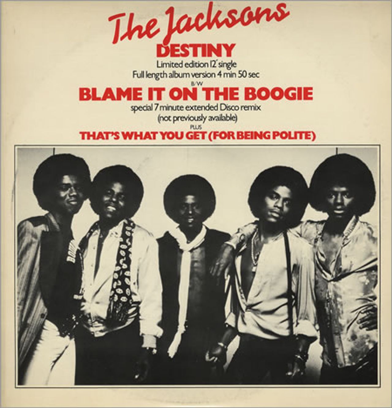 THE JACKSONS Destiny (1979 UK limited edition 3-track 12'' single, including a previously unavailable 7 minute extended Disco remix of Blame It On The Boogie plus That's What You Get, housed in a nice group-shot picture sleeve. The sleeve showsminimal wear & the vinyl appears barely played 12-6983)
