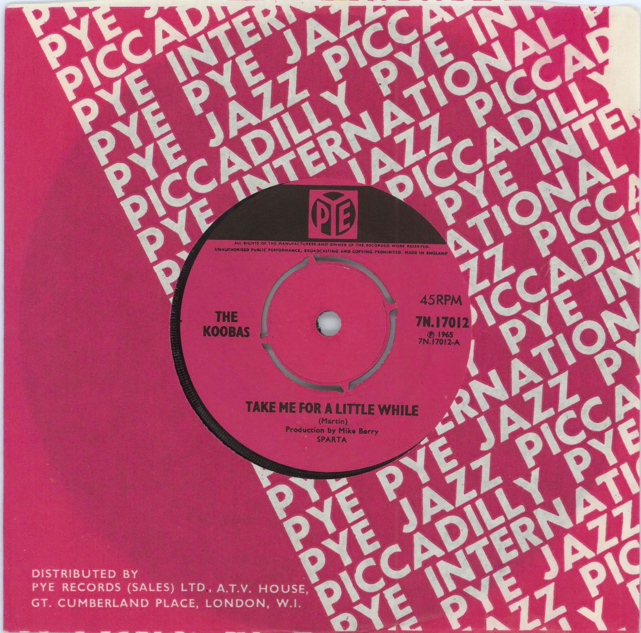 THE KOOBAS Take Me For A Little While (Rare archive quality 1965 UK 7" vinyl single on the Pye label with an intact four prong centre. The second release from the English beat group from Liverpool. Also including Somewhere In The Night, within a Pye company die-cut paper sleeve. This one previous owner copy remains in an outstanding condition, the labels have no spindle marks and the vinyl looks to have never seen a turntable, even the sleeve looks as fresh as the day it was manufactured. A stunning example and the first we have ever seen!)