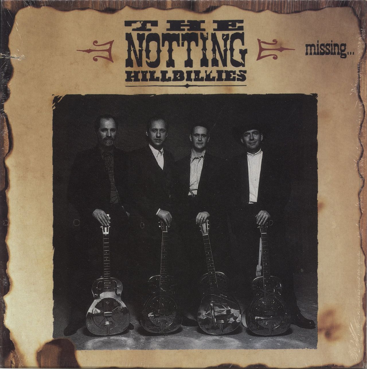 THE NOTTING HILLBILLIES Missing... Presumed Having A Good Time (1990 US first press 11-track LP starring Mark Knopfler, Steve Phillips, Guy Fletcher & Brendan Croker, housed in a picture sleeve with a deletion saw-cut & illustrated lyric inner. The sleeve is still in the open shrinkwrap & the vinyl is Near Mint)