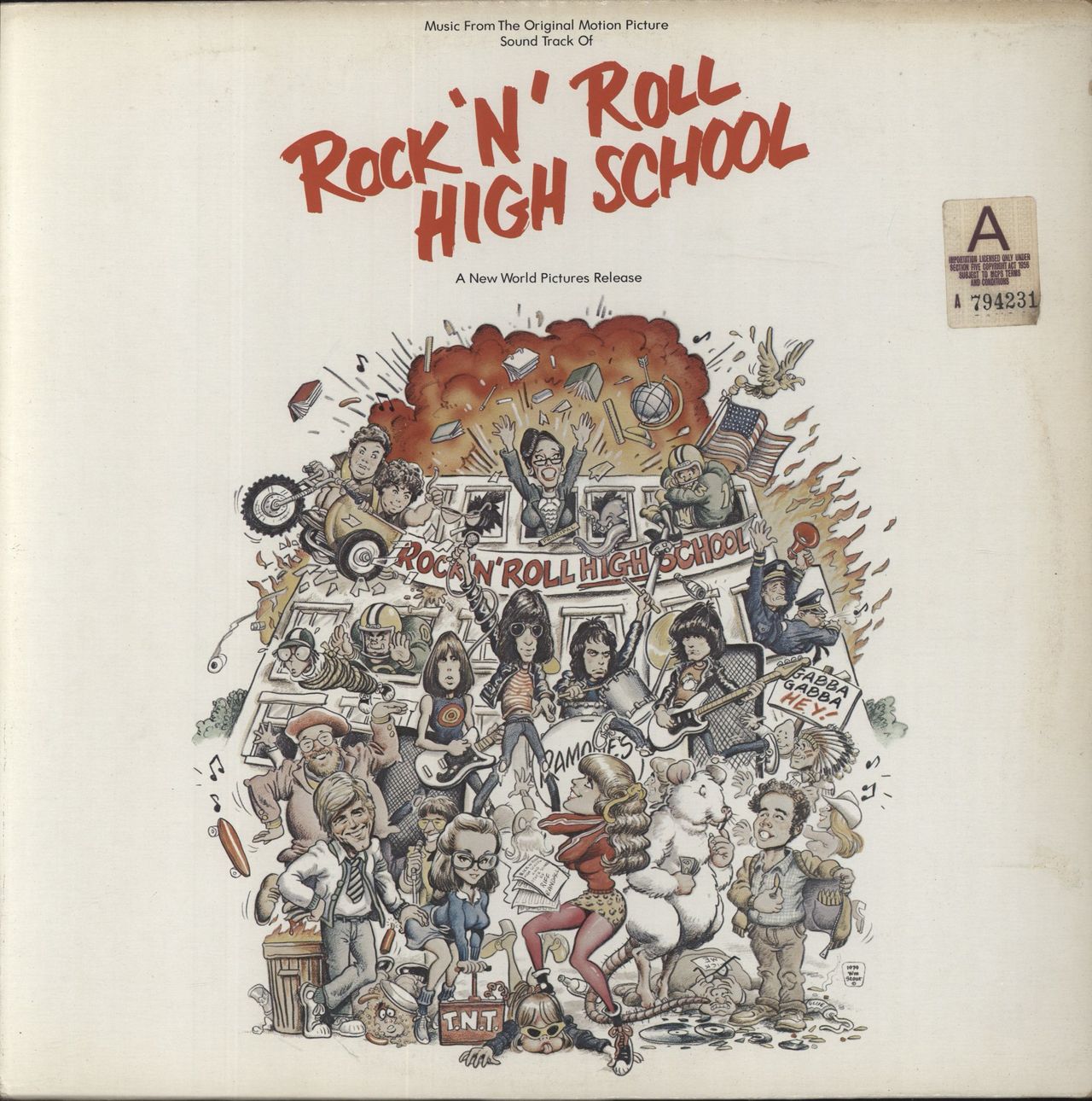 THE RAMONES Rock 'N' Roll High School (1979 Canadian 13-track vinyl LP featuring music from the soundtrack of the film including I Want You Around, Ramones Medley and Come On Let's Go [performed with the Paley Brothers] plus recordings by NickLowe, Brian Eno, Devo and more, picture sleeve. The sleeve retains an import sticker and has a small split to the bottom seam and shows some edgewear. Whilst the vinyl has a few light surface scuffs. A respectable copy and ideal collection filler, offered at an advantageous price QSR6070)