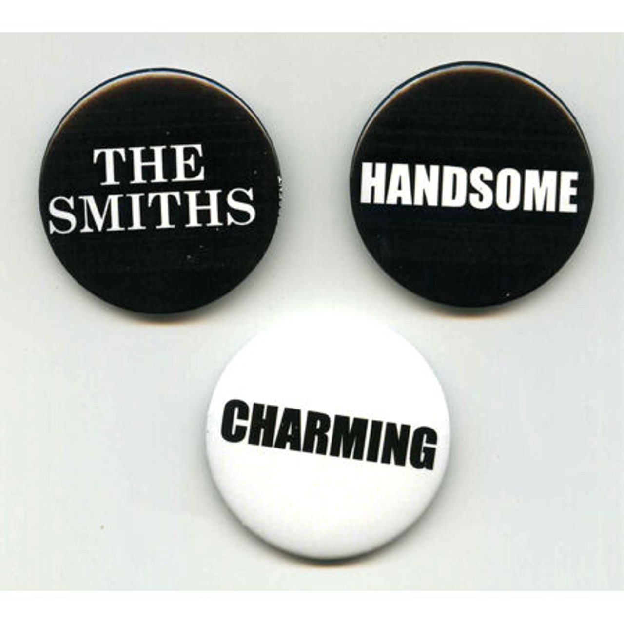 THE SMITHS The Sound Of The Smiths (2008 UK promotional-only set of THREE 1½" diameter black & white badges to promote the 'Greatest Hits' release. Each badge features a different logo, 'The Smiths', 'Charming' and 'Handsome' - A cool promo set!)