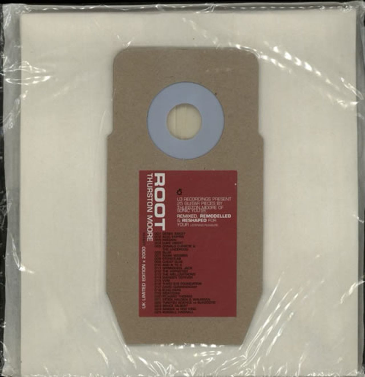 THURSTON MOORE Root (1998 UK limited edition 25-track CD, featuring twenty-five guitar pieces by Thurston Moore of Sonic Youth, transformed by the likes of Derek Bailey, Alec Empire, Mogwai, Luke Vibert, Blur, Stereolab, David Cunningham, Merzbow, Bruce Gilbert, Russell Haswell & more. The CD and booklet are packaged in a custom stickered hoover bag - still sealed in the number stickered outer protective cover LCD11X)