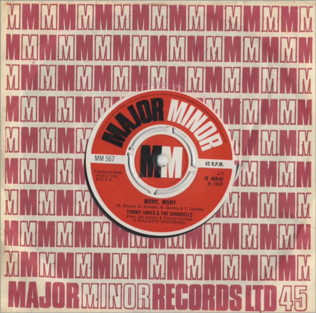 TOMMY JAMES & THE SHONDELLS Mony, Mony (1968 UK 7" single with intact four prong centre, also including One Two Three And I Fell, Major Minor die-cut company paper sleeve MM567)