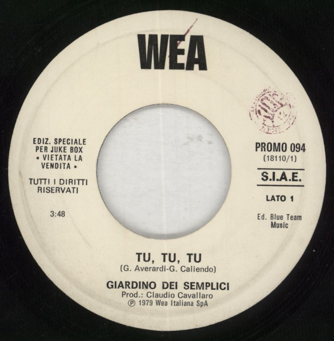TUBEWAY ARMY Are' Friends' Electric (1979 Italian promotional Jukebox wide centre vinyl 7" for the single release, with matrix number 'K11352-1' and is actually the B-Side, with 'Tu, Tu, Tu' by Il Giardino Dei Semplici on the A-Side, housed in a plain die-cut paper sleeve. The vinyl remains Excellent with just a few light signs of play)