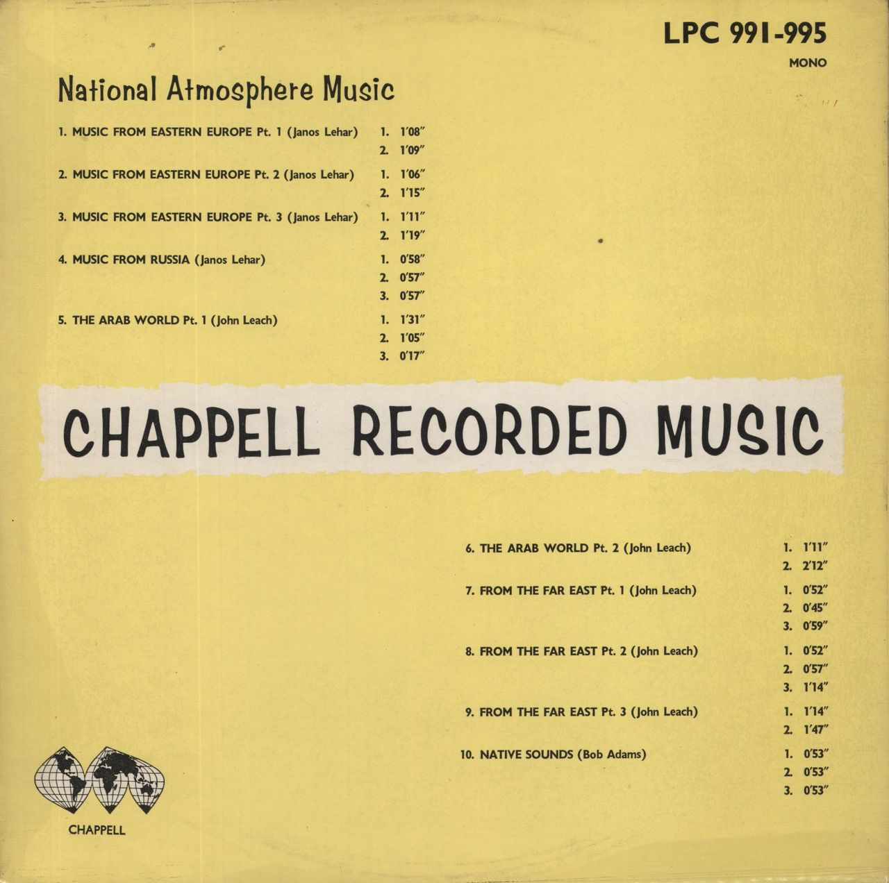 VARIOUS-WORLD MUSIC National Atmosphere Music (1969 UK 25-track vinyl LP. A compilation of atmospheric world inspired music, released as part of the Chappell Recorded Music series. Laminated picture sleeve. The sleeve shows some laminate liftto the edges ans shows just a little age wear. The vinyl shows light signs of play. An Excellent copy )