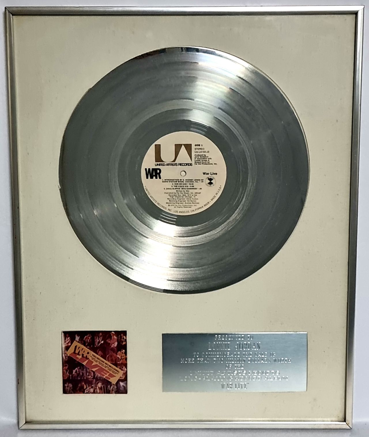 WAR War Live (Rare 1973 US official RIAA certified Double Platinum award issued to commemorate American sales in excess of $2,000,000 worth of the United Artists LP, presented to Lonnie Jordan. This award, perched on a white-matte background, features a platinum LP mounted above a miniature of the album artwork with a custom engraved dedication plaque. A fine opportunity to own an original '70s award which was presented to the artist)