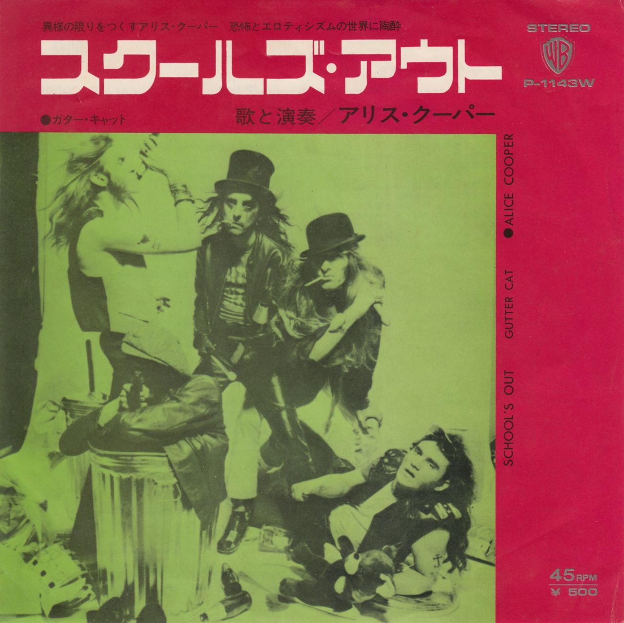 ALICE COOPER School's Out (Rare original 1972 Japanese Warner green label 7" vinyl single, also including Gutter Cat, complete with the unique green and red picture insert, featuring a great image of the band with trashcans (dust bins) and printed with English lyrics to both tracks on the reverse. The insert has minimal wear whilst the vinyl shows light scuffs leaving it Excellent P-1143W)