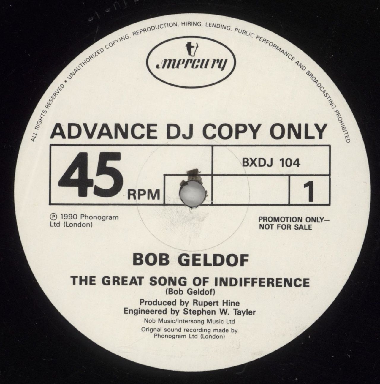 BOB GELDOF The Great Song Of Indifference (1990 UK Advanced DJ Copy 3-track 12" for the single release, also includes 'Hotel 75' and 'In The Pouring Rain', die cut sleeve. BXDJ104)