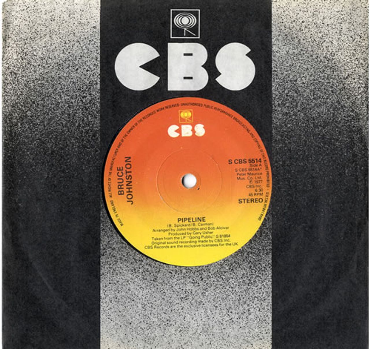 BRUCE JOHNSTON Pipeline (1977 UK solid centre 7" vinyl single, a classic Boogie Disco version of the tune by the Beach Boy, also featuring Disney Girls, die-cut company sleeve SCBS5514)