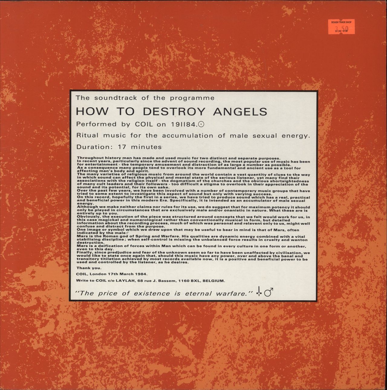 COIL How To Destroy Angels (Rare 1988 Belgian issue of the 1984 single-sided mini-LP with black & white labels, featuring an astonishing seventeen minute piece described as 'ritual music for the accumulation of male sexual energy'. The B-side, although crediting Absolute Elsewhere is non-grooved & intentionally unplayable! The glossy picture sleeve is Excellent with minor shelf wear & has its Rough Trade import price sticker attached. The vinyl is clean & in Excellent condition with little play LAY5)