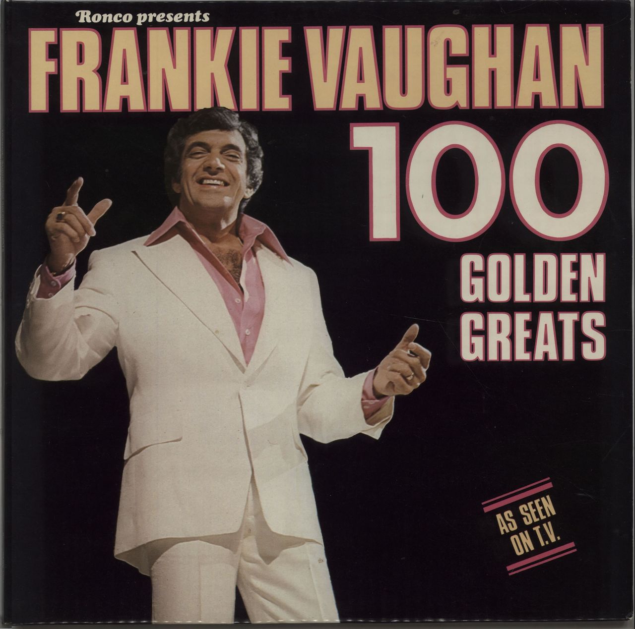 FRANKIE VAUGHAN 100 Golden Greats (1977 UK 100-track double vinyl LP, glossy gatefold picture sleeve with track details, note from Frankie and a short biography across the centre spread. The sleeve shows some edge scuffing, whilst the vinyl displays the odd light sign of play but remains excellent RTDX2024)