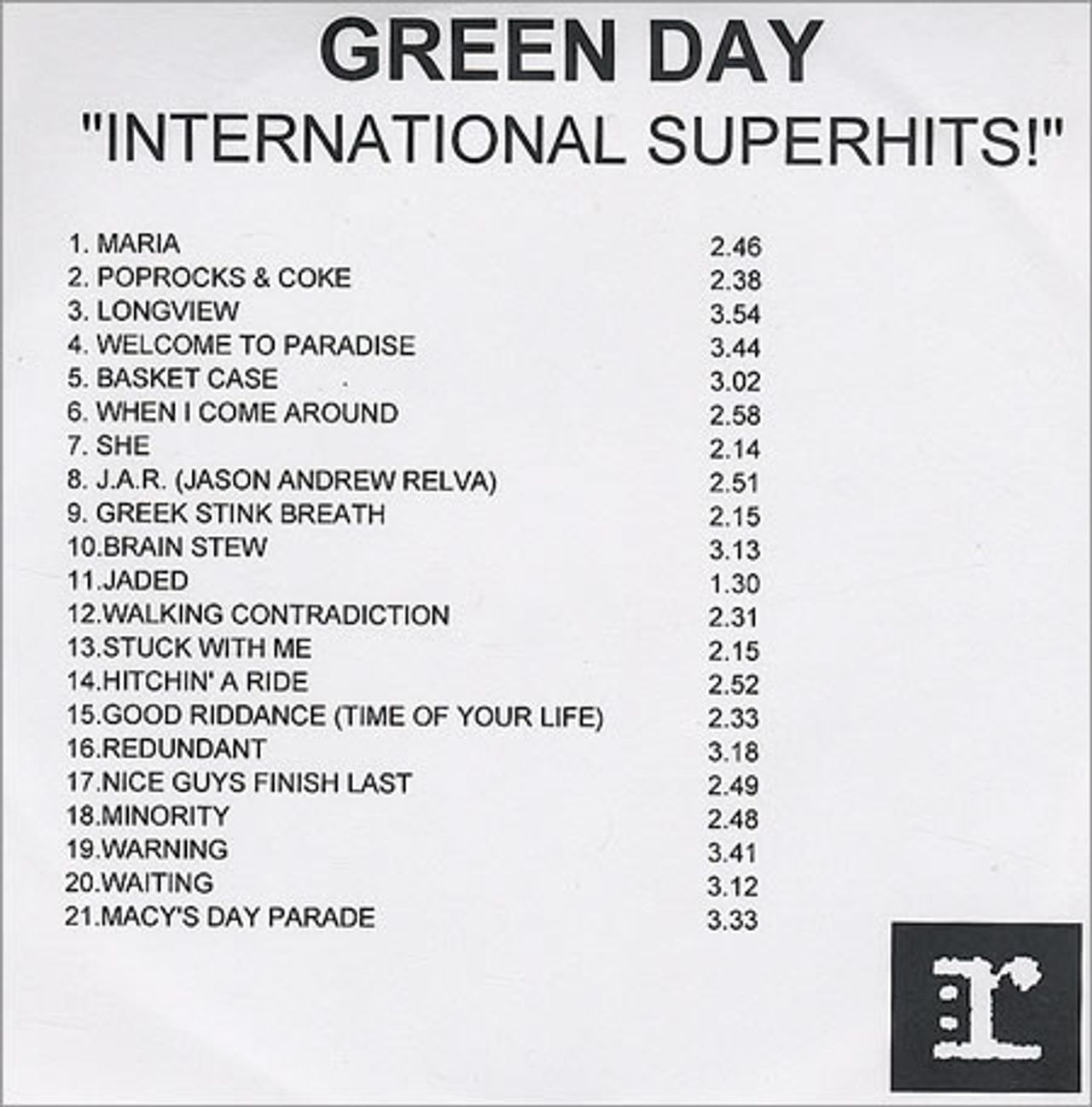 GREEN DAY International Superhits! (2001 UK Reprise 21-track advance promotional CD-R of the compilation album, including Basket Case, Geek Stink Breath, Warning and Minority, plus new songs Maria and Poprocks & Coke, custom printed disc & title/tracklisting inlay)