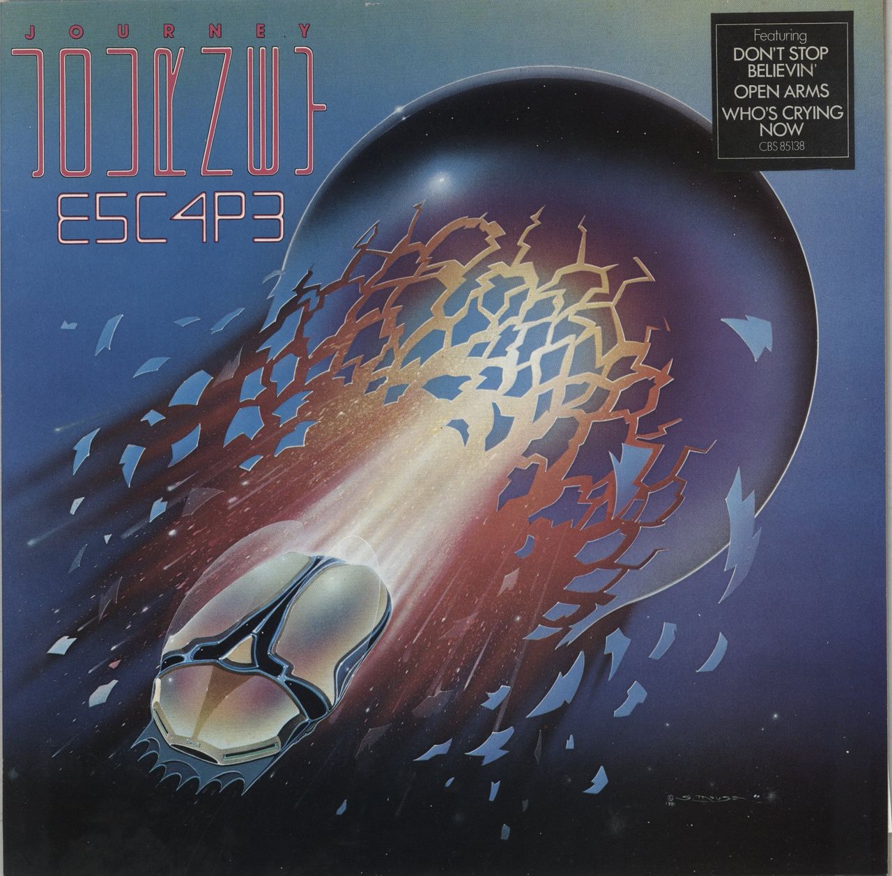 JOURNEY Escape (1981 UK 10-track LP on the graduated orange label, including the massive hit 'Don't Stop Believin'. Comes housed in a glossy picture sleeve with the black square-shaped song hype sticker attached. Complete with the lyric insert, the sleeve shows minimal wear & the vinyl still looks barely played)