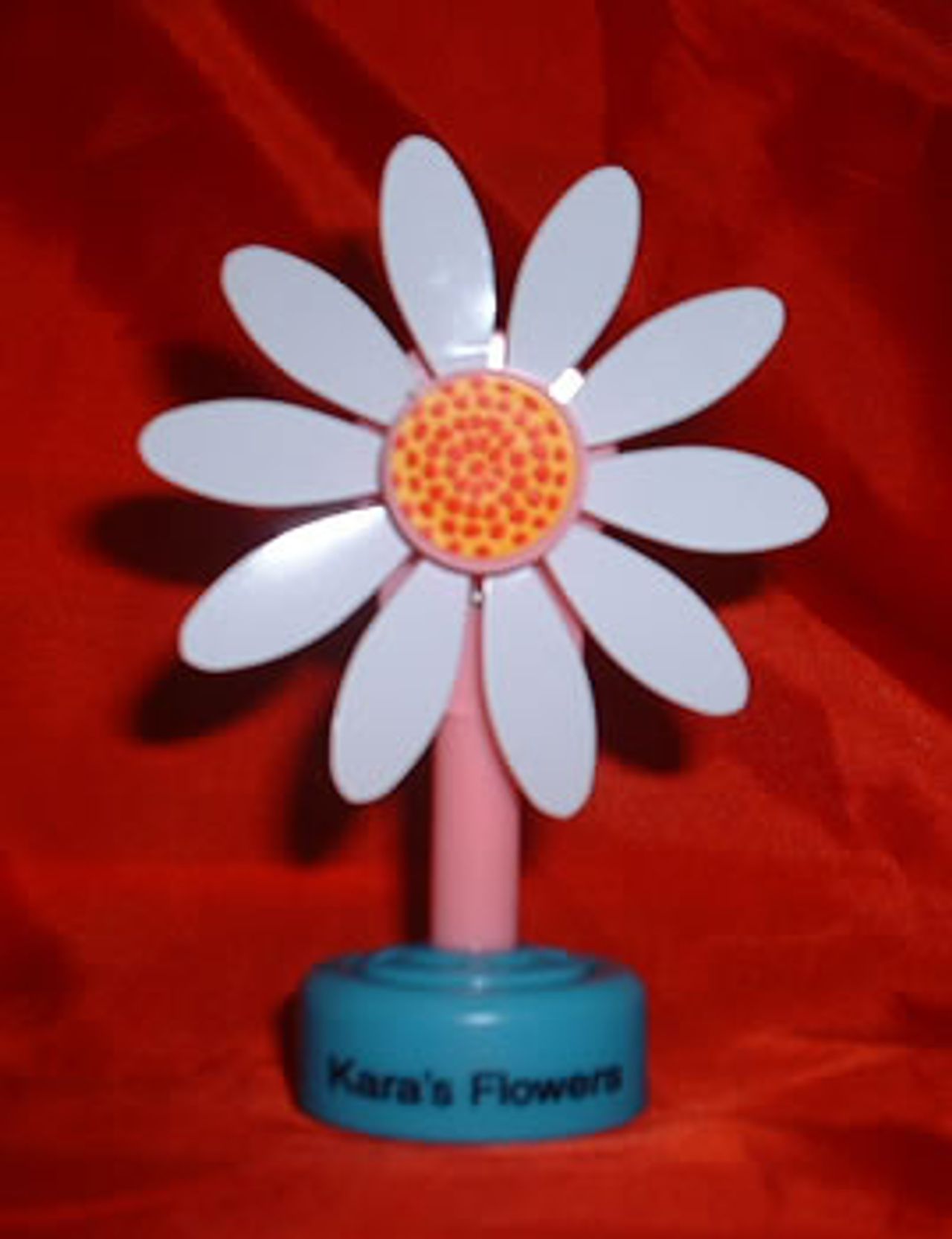 unique 3½" tall standing wind-up powered fan effect flower design.