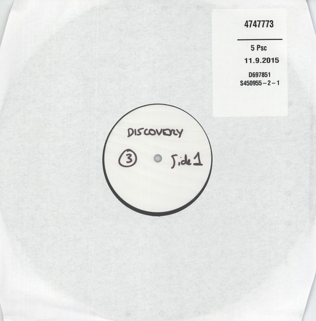 MIKE OLDFIELD Discovery (2015 UK 8-track white label LP test pressing, presson on 180gram vinyl, originally released in 1984. This would have been pressed to check the quality & the sonics of the pressing before the finished product was manufactured. Plain white labels with the title & side number hand written, housed in a die-cut card sleeve)