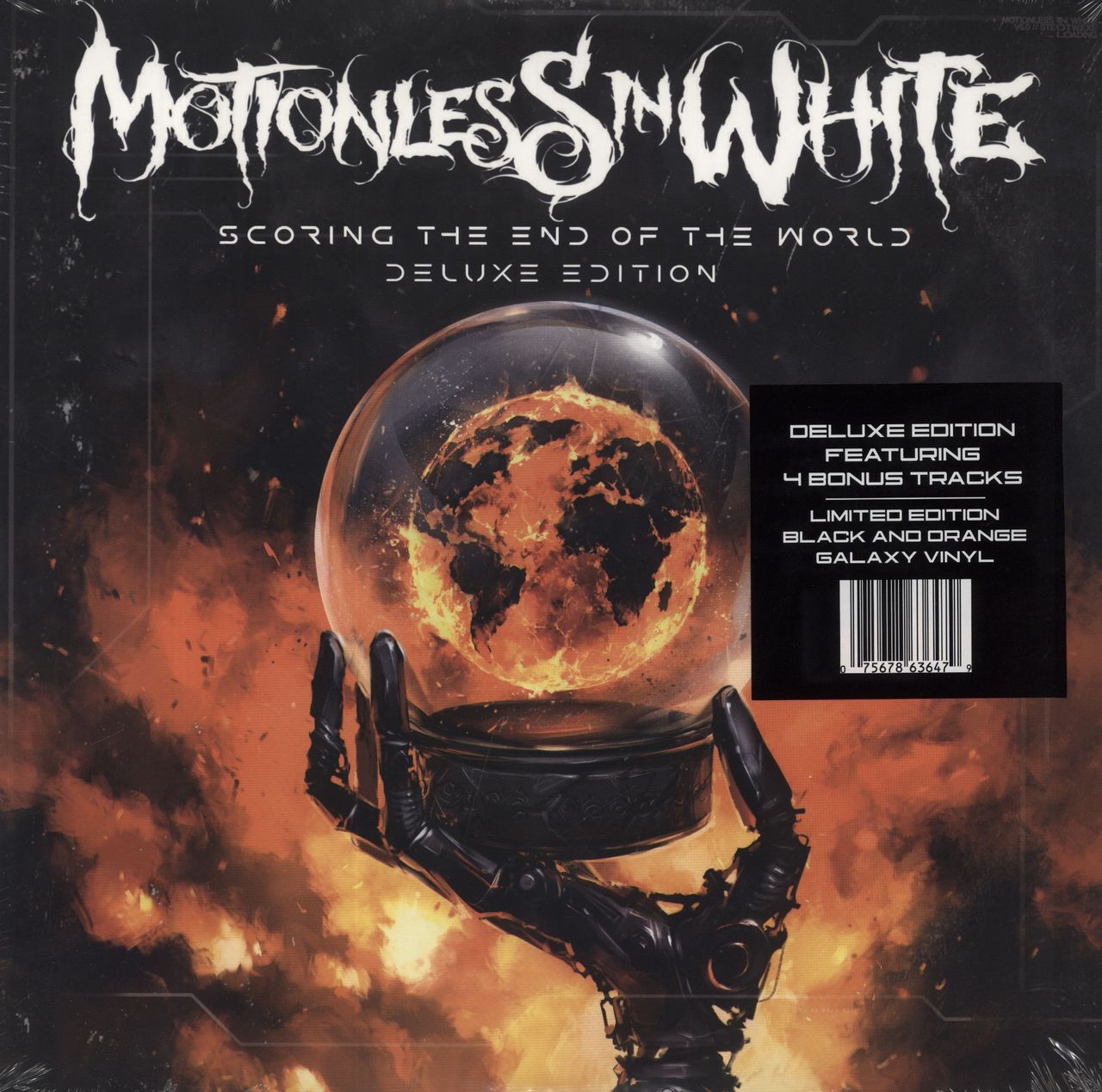 MOTIONLESS IN WHITE Scoring The End of The World (Limited 2023 US Deluxe Edition 17-track double LP, with gatefold picture sleeve and pressed on Orange and Black Galaxy Vinyl. Sixth studio album from the US metalcore band, whichfeatures guest appearance from Caleb Shomo of Beartooth, and Bryan Garris of Knocked Loose. This copy remains sealed from new in its original, hype-stickered shrink and is in mint, unplayed condition)