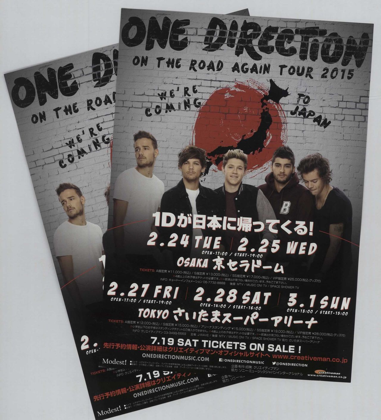 ONE DIRECTION Live In Japan 2015 (A pair of identical official 2015 7" x 10" handbill flyers produced to promote the Japanese leg of their 'On the Road Again' Tour which saw them take to the stage for two nights at the Kyocera Dome in Osaka and Saitama Super Arena [three dates listed, a fourth was later added] between 24th February - 2nd March. Just a couple of weeks after these performance, Zayn announced he was to leave the band so these would have been one of the last opportunities to the see the band as a five-piece. The flyer features an image of the band infront of an illustration of the Japanese flag with their name, tour name & 'We're Coming To Japan' printed above in a black font and all venue & ticket information below in white. On the reverse side, there is an advertisement for their first three studio albums. Would look fantastic framed!)