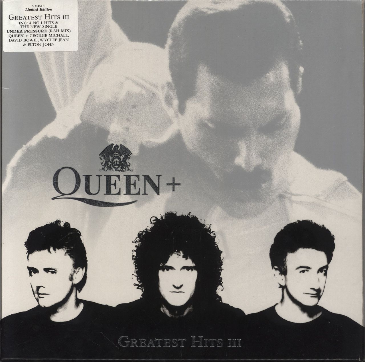 QUEEN Greatest Hits III (Rare 1999 UK first issue limited edition 17-track vinyl 2-LP compilation, including Under Pressure [Rah Mix] with David Bowie & Somebody To Love with George Michael, within an individually numbered picture sleeve withillustrated inners & custom printed silver embossed PVC outer with an intact hype-sticker attached. The sleeve is in Near Mint condition [just a couple of very minor crease lines if we are being pedantic], the inners and vinyl are also Near Mint - A superb copy with no need to upgrade)