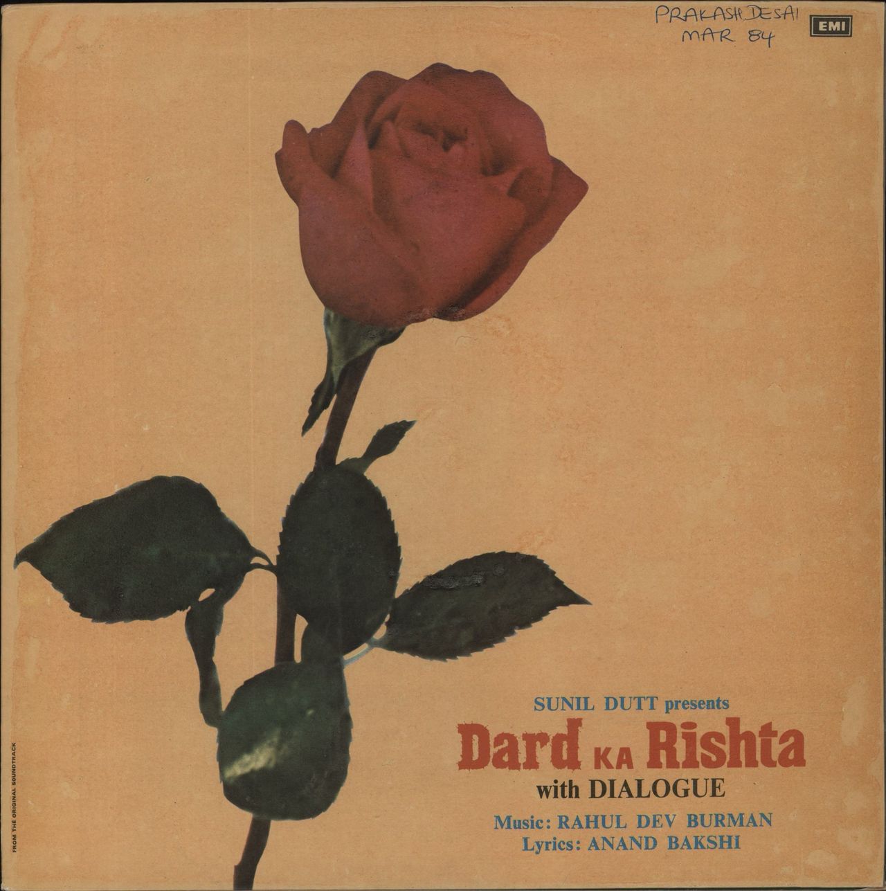 ORIGINAL SOUNDTRACK Dard Ka Rishta (With Dialogue) (1983 Indian 13-track vinyl LP soundtrack, R. D. Burman's movie score featuring performances by Kishore Kumar and Lata Mangeshkar, gatefold picture sleeve. The sleeve shows moderate wear witha name annotation to the front, whilst the vinyl is Excellent & appears barely played ECLP5870)