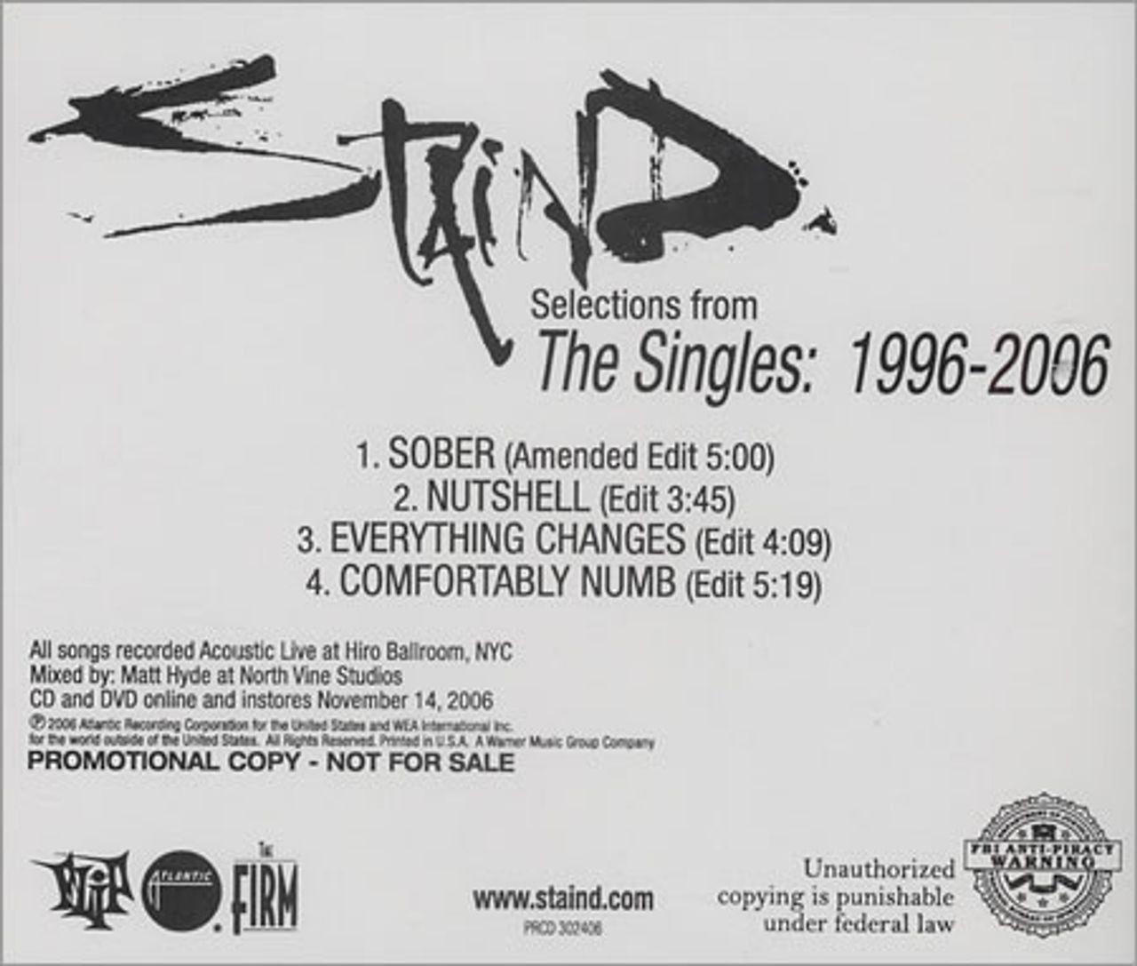 Staind Selections from The Singles 1996-2006 US Promo CD single