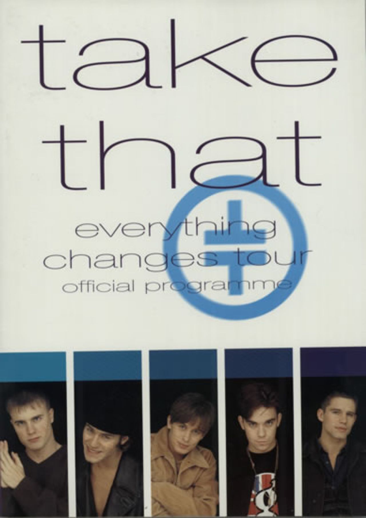 TAKE THAT Everything Changes Tour (Official 1993 UK 28-page 24½ x 34½cm tour programme packed with loads of great individual and group photographs, profiles with facsimile autographs and tour dates, with a great glossy cover. This copy comes with the original fold-out merchandise insert with colour picture cover!)