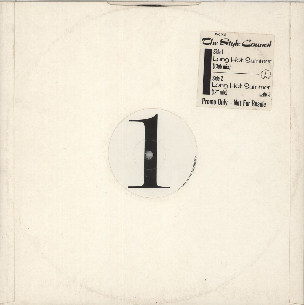 STYLE COUNCIL Long Hot Summer (1983 UK 2-track 12" vinyl promo single. Includes Club Mix and 12" Mix. Plain die-cut sleeve with custom sticker. The vinyl is Excellent with just a couple of hairlines and light signs of play TSCX3)