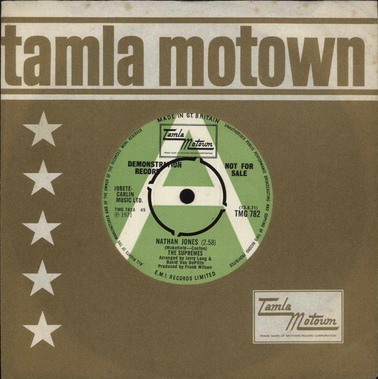 THE SUPREMES Nathan Jones (1971 UK 'A-Label' 4-Prong 7" vinyl single with custom 'Not For Sale' print across the centre also including Happy (Is A Bumpy Road), Tamla Motown company die-cut paper sleeve. The vinyl shows a few light hairlines with no rel impact on play TMG782)