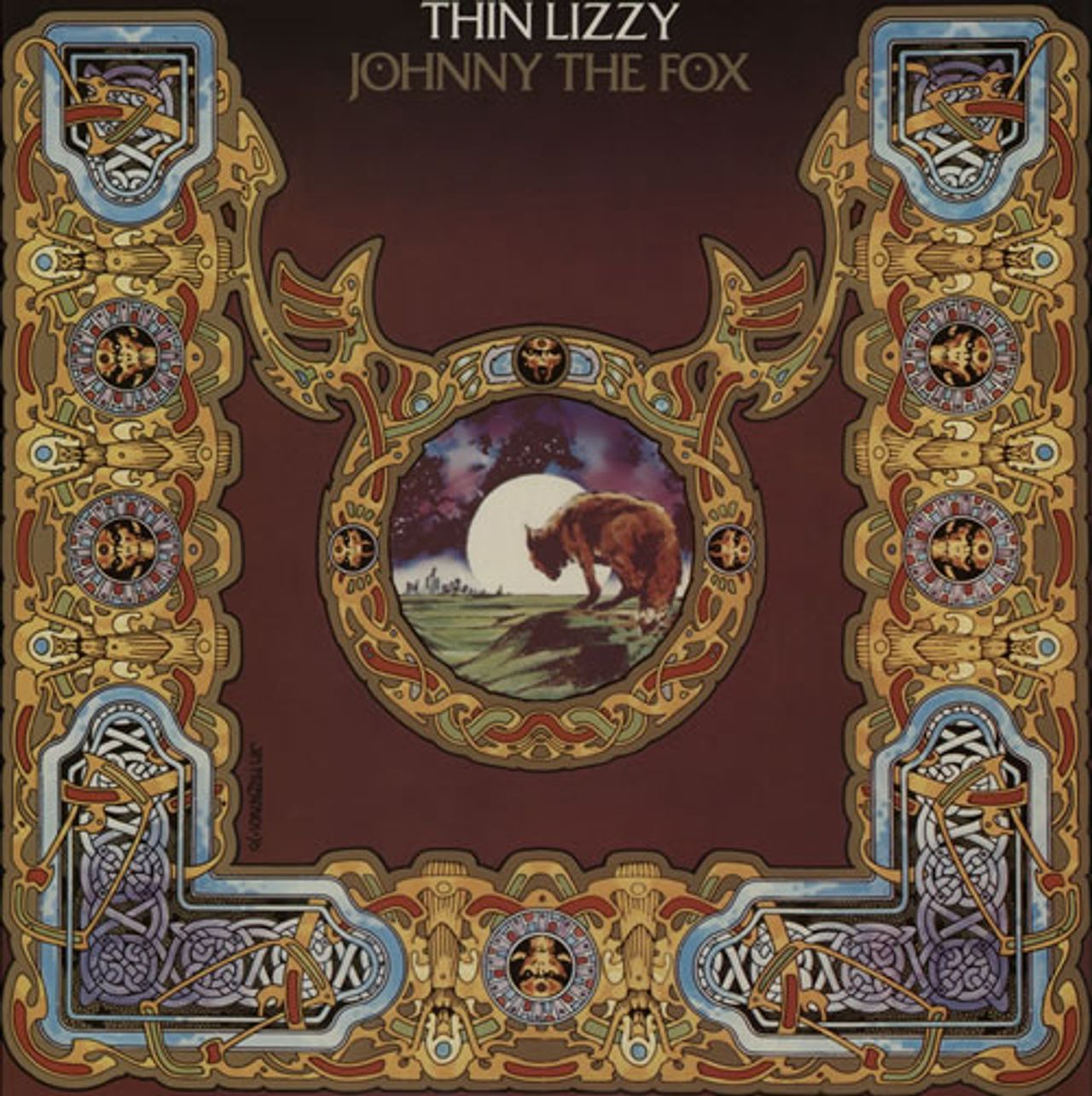 THIN LIZZY Johnny The Fox (1976 first UK issue 10-track LP with 'Bilbo 'N' Quakers!' & 'Bilbo Master Room' scratched into the run-out groove, the label also has the track Borderline mispelt 'Borderlne'. This is the follow-up to the classic album Jailbreak, featuring Don't Believe A Word, Massacre & Johnny The Fox Meets Jimmy The Weed, with illustrated inner & the picture sleeve designed by the band's regular artist from the period Jim Fitzpatrick. The sleeve displays minimal wear &the vinyl looks barely played. A stunner!)