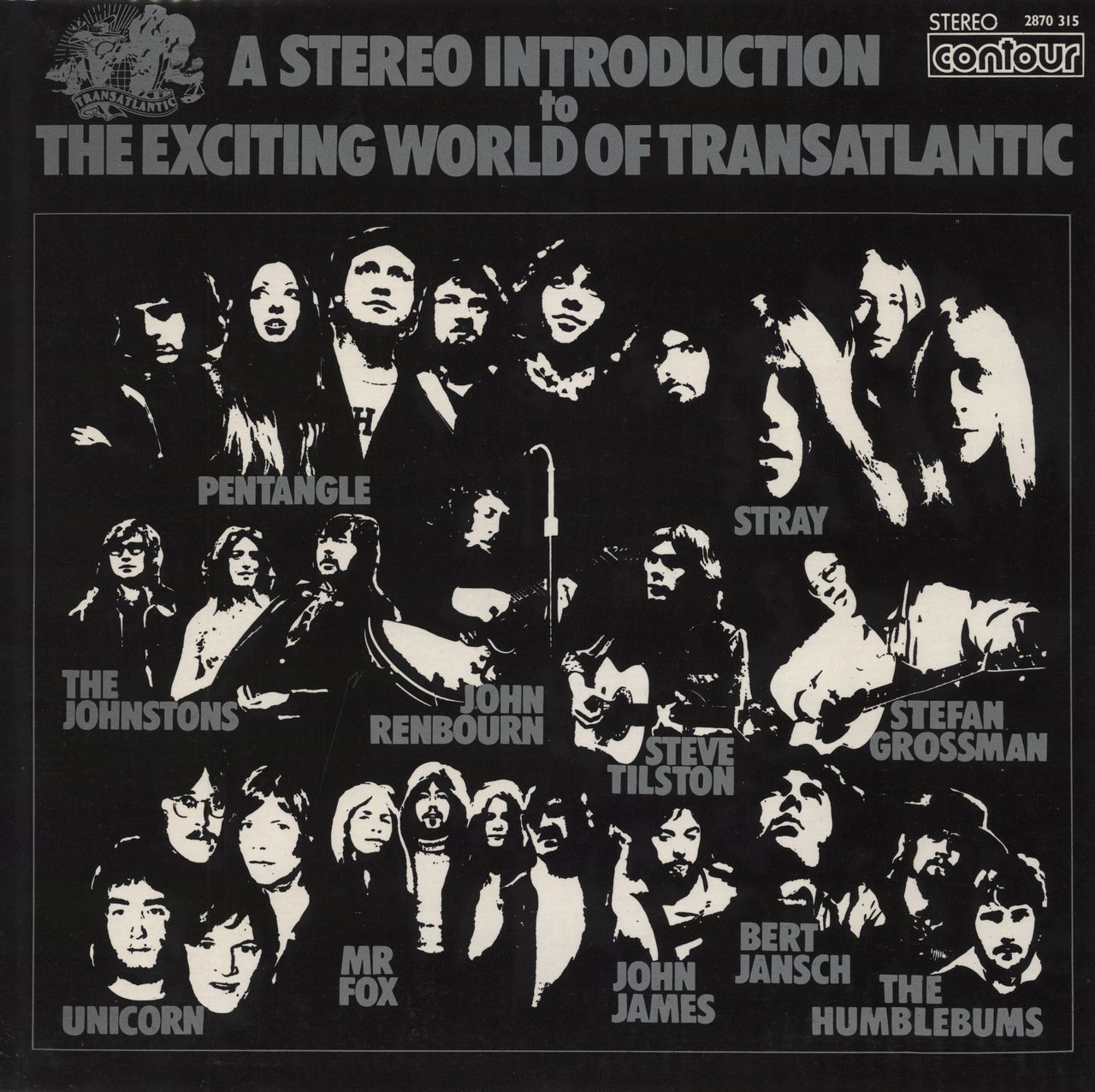 VARIOUS ARTISTS A Stereo Introduction To The Exciting World Of Transatlantic(Early 70s UK 12-track vinyl LP sampler for the Transatlantic label, featuring choice selections from Pentangle [plus Bert Jansch and John Renbourn solo], The Johnstons, The Humblebums, Unicorn, Mr. Fox, Stray, Stefan Grossman and more, fully laminated picture sleeve complete with fold-out poster featuring the company logo and a list of the roster)