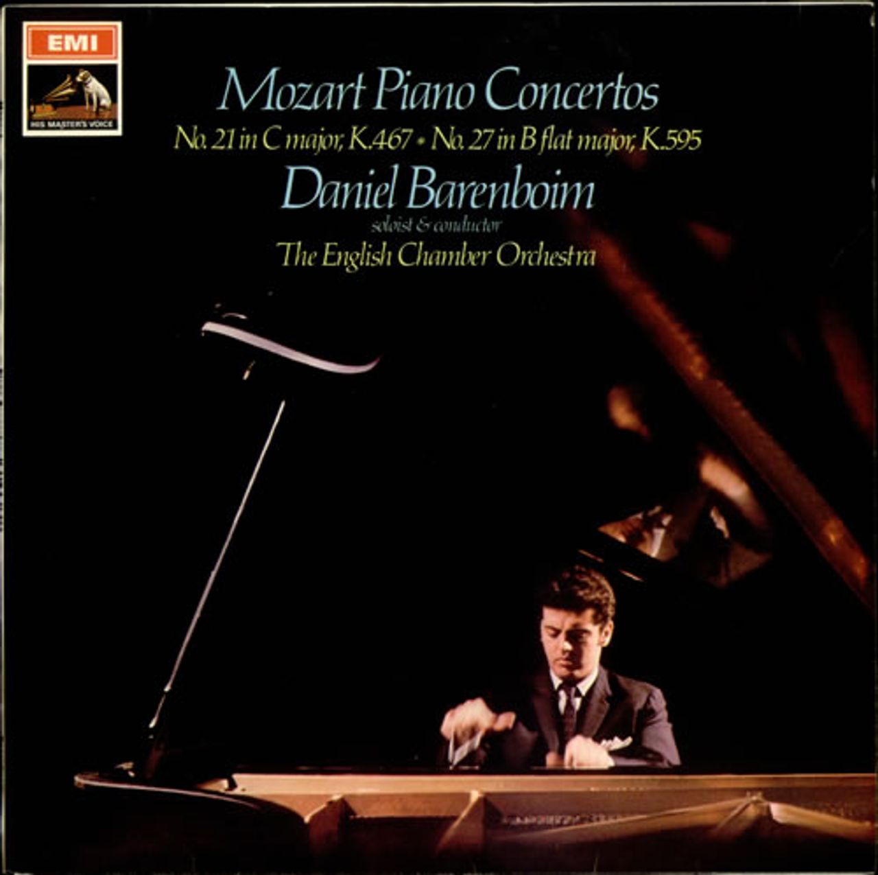 MOZART Piano Concerto No. 21 in C major, K.467 & Piano Concerto No. 27 in B-flat major, K.595 (1967 UK 6-track HMV black and white stamp label stereo vinyl LP, performed by Daniel Barenboim with the the English Chamber Orchestra, front laminated picture sleeve. The sleeve has a 2" seam split to the top and the vinyl is Excellent & appears barely played ASD2465)